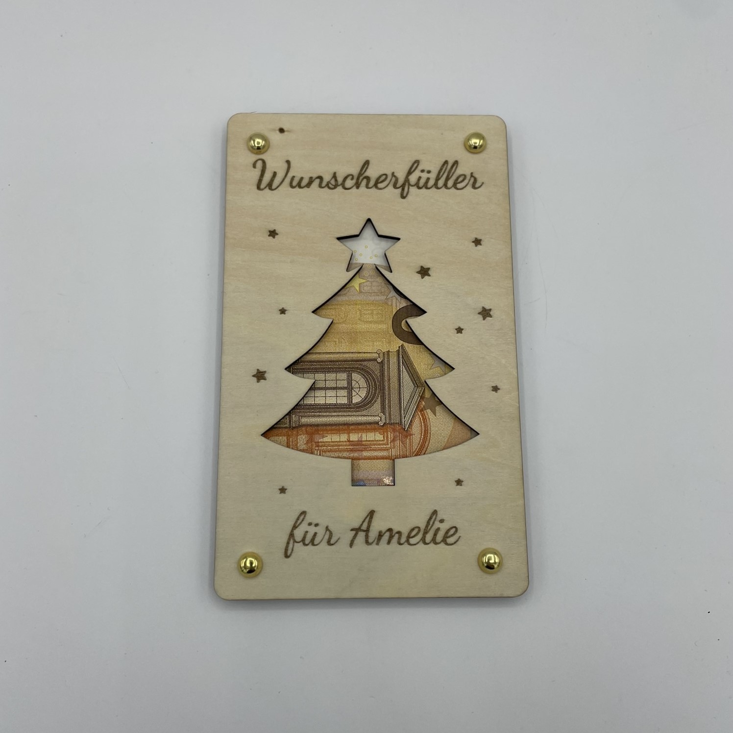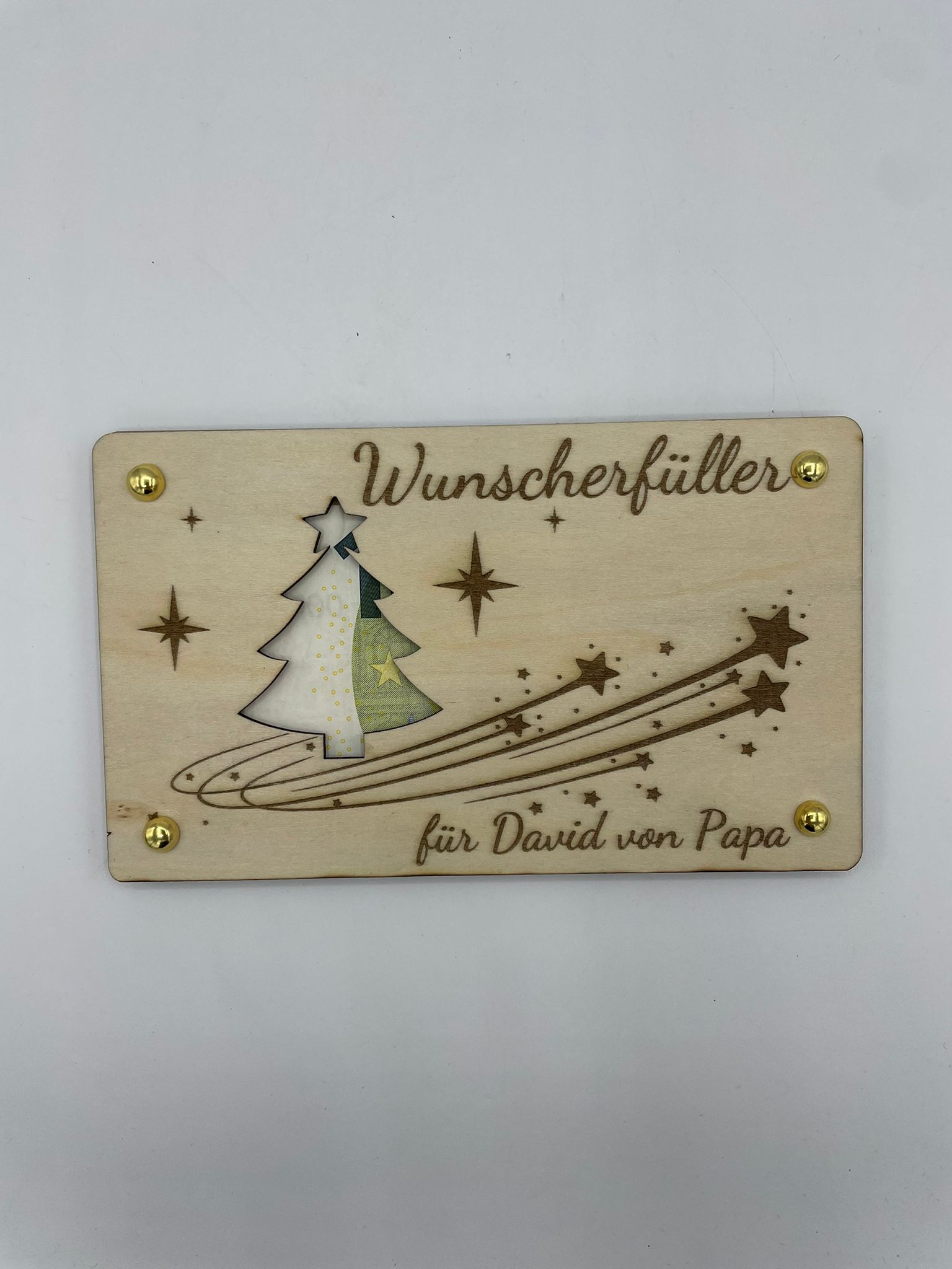 Birkenholz Graviert mit verschiedenen Motiven. Zwei 3mm Birkenholzplatten die durch Musterbeutelklammern zusammen gehalten werden. Es lassen sich Geldscheine zwischen die beiden Platten klemmen die man dann im Sichtfenster sehen kann.