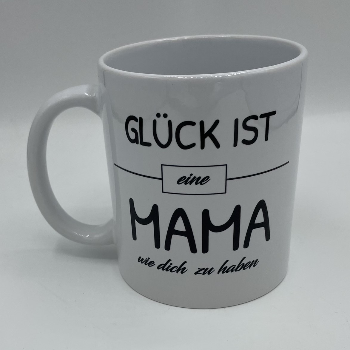 Tasse mit dem Text Glück ist eine MAMA wie dich zu haben. Auf der Rückseite kann ein eigenes Bild aufgedruckt werden.