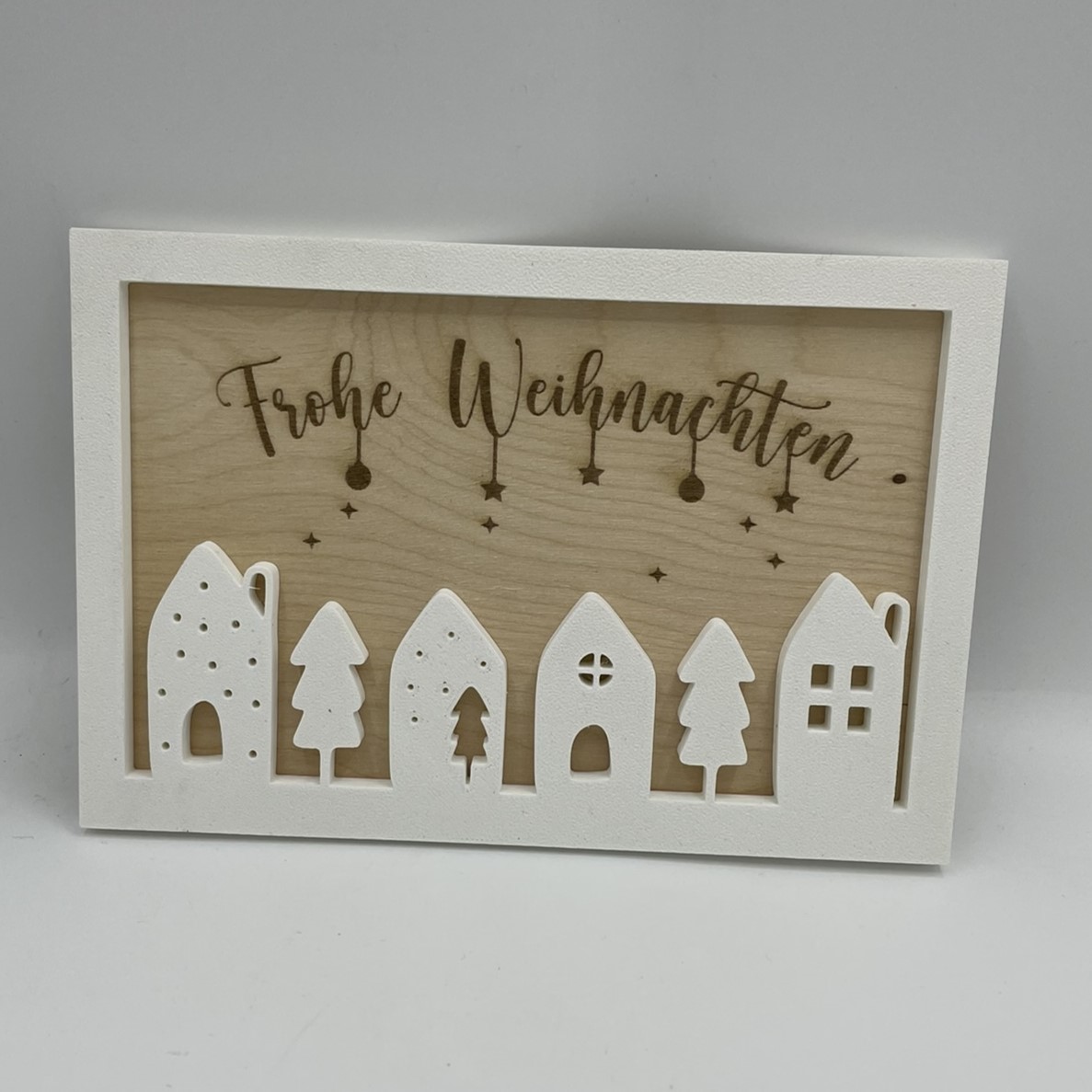 Weißer 3D Gedruckter Kunststoffrahmen mit Lasergraviertem Birkenholz im Hintergrund.